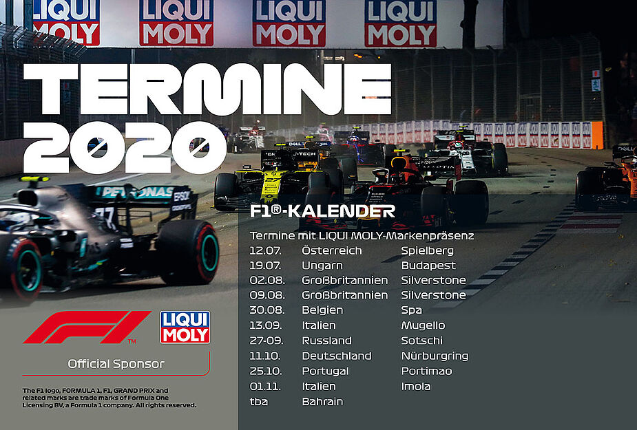 Auch LIQUI MOLY ist als Sponsor bei allen neu terminierten Rennen dabei. Nach wie vor sorgt unser Sponsoring für eine riesige Steigerung unserer Markenbekanntheit rund um den Globus. Flankiert wird das Sponsoring nach wie vor unserem TV-Werbespot, der auch während der RTL-Liveübertragungen ausgestrahlt wird.
